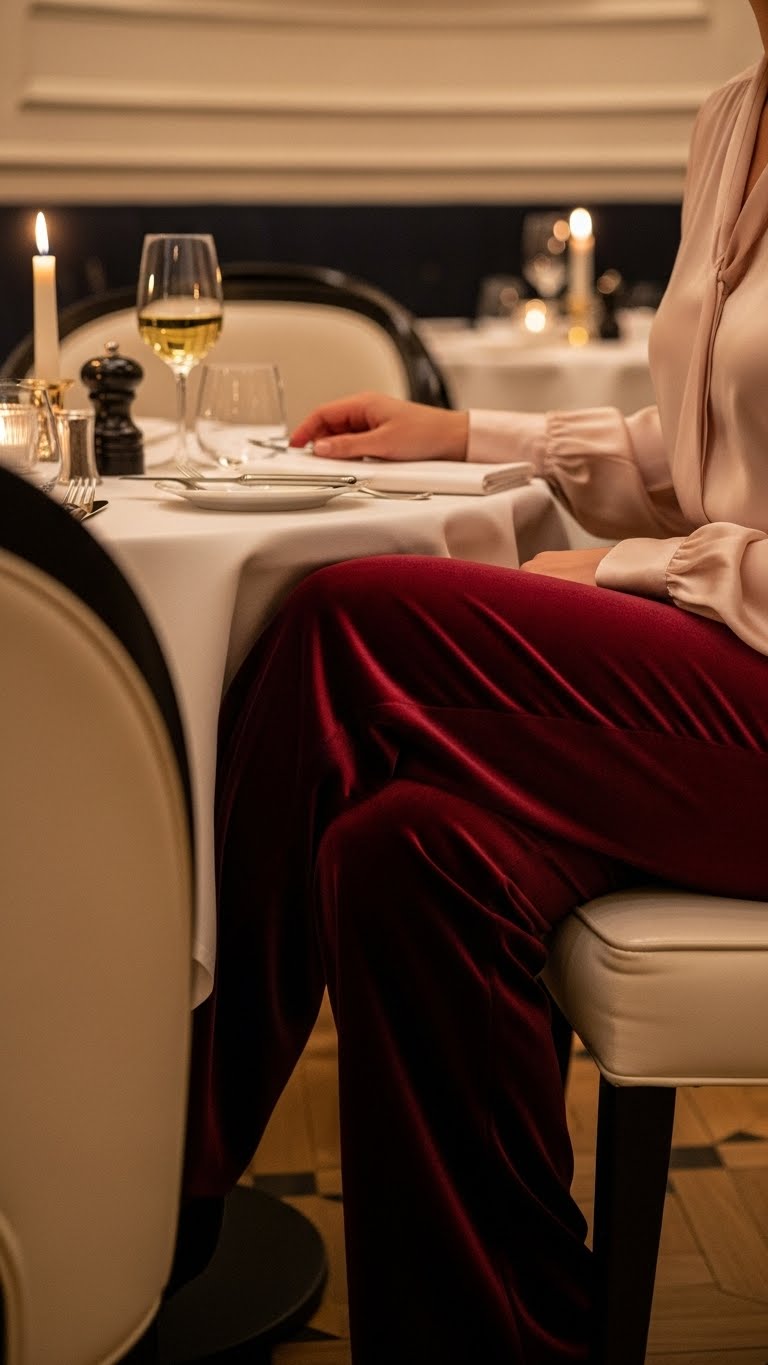You’ll love the luxe touch under soft lighting; choose color coordination that frees you — deep wine trousers with a blush satin blouse pairing, or midnight with cream.