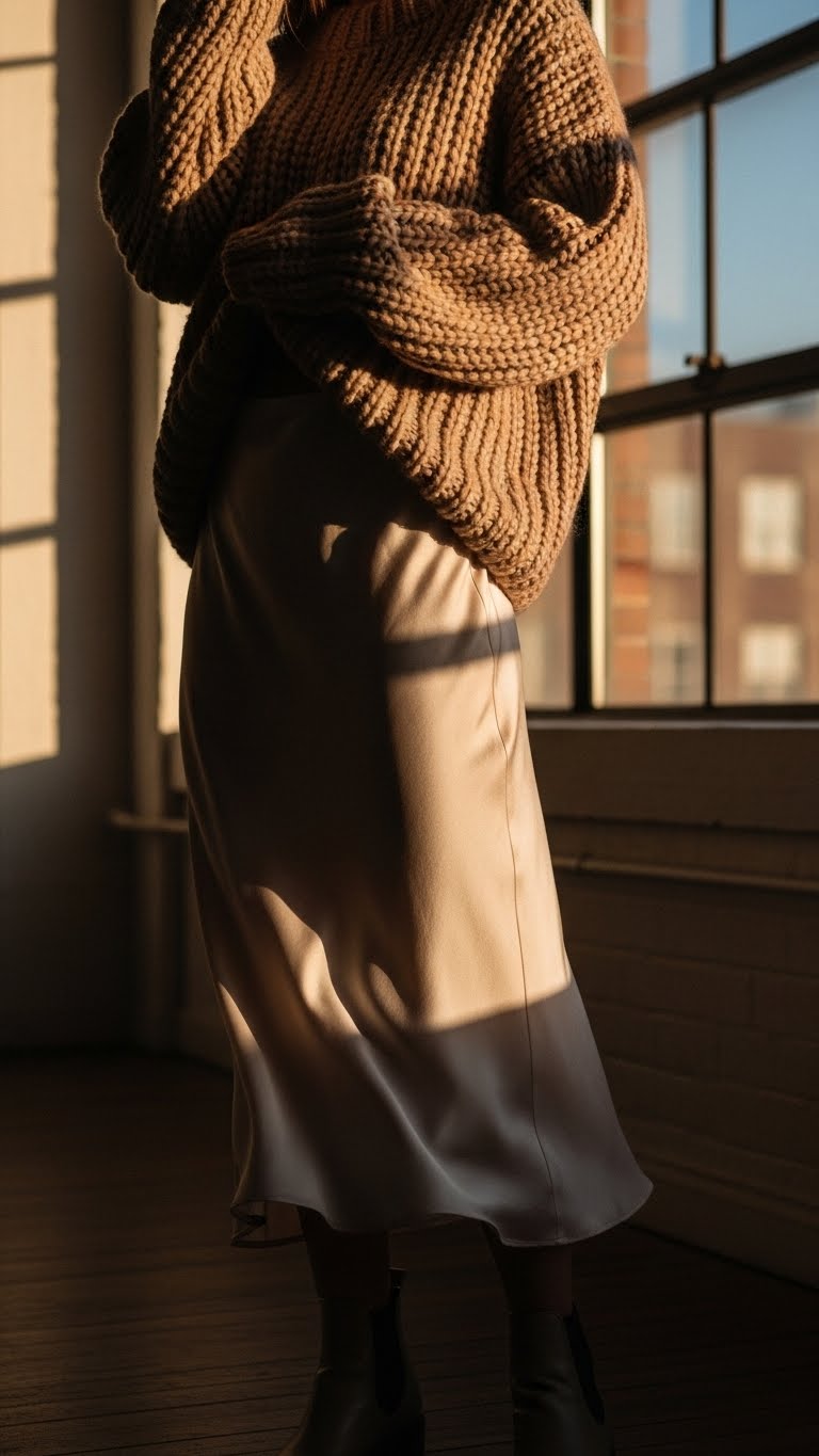 Often you’ll balance soft and substantial pieces by pairing a fluid silk slip skirt with a chunky knit sweater, letting the skirt’s whispery sheen contrast against tactile, oversized stitches.