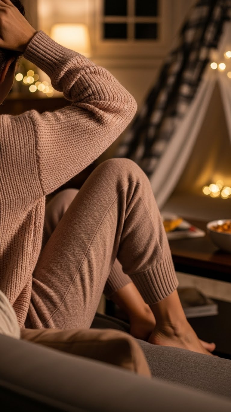 You sink into soft ribbing, tie your hair back, and build a blanket fort for cinematic solitude. Grab movie snacks, dim fairy lights, and let buttery knit and tapered cuffs cradle you—effortless, warm, and oddly liberating for slow nights in.