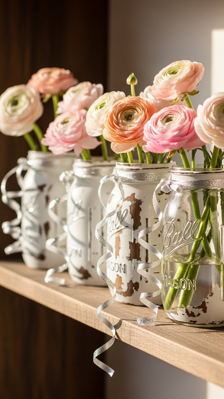 Brighten a shelf in minutes with rustic mason jar sitters dressed in soft ranunculus and looping silver ribbon—an effortless mix of farmhouse charm and modern shimmer. You’ll tuck a petite ranunculus arrangement into a distressed mason jar, tie a sleek silver ribbon, and position each shelf sitter for airy, liberated vibes.