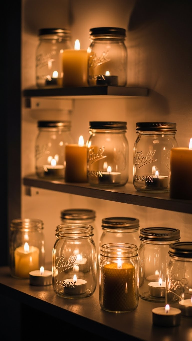 Ambience matters—set it with vintage mason jar lanterns that turn ordinary shelves into glowing vignettes. You’ll love how the antique glow softens rooms; cluster jars at varied heights for intimate mood lighting.