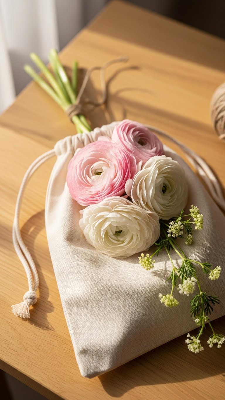 Canvas Gift Bags With Ranunculus and Sweet Annie Greenery