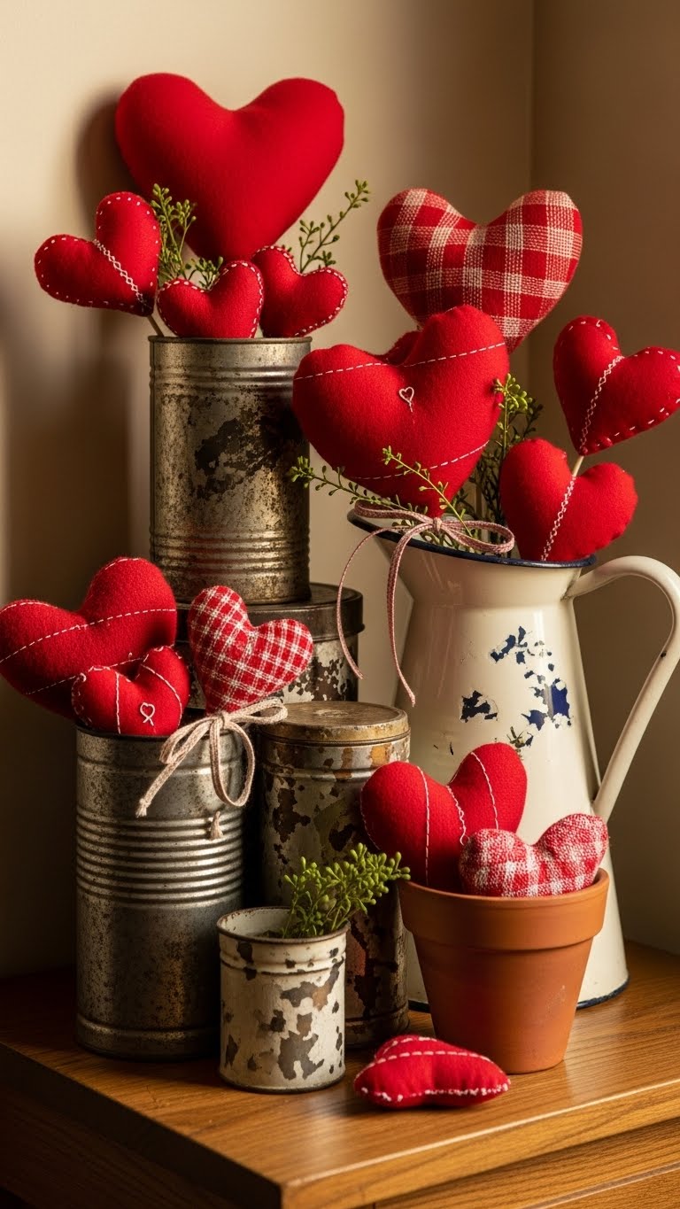 Pair vintage charm with playful romance by arranging red stuffed hearts like blossoms in worn metal tins, terra-cotta pots, or chipped enamel pitchers.