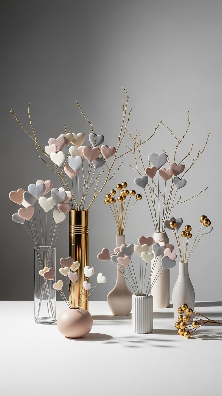 You’ll push lightweight skewer hearts into clustered stems or minimalist branches, creating airy rhythm and movement. Use varied heights, metallic skewers, and muted palettes for modern vase accents that feel liberated, effortless, and unmistakably chic.
