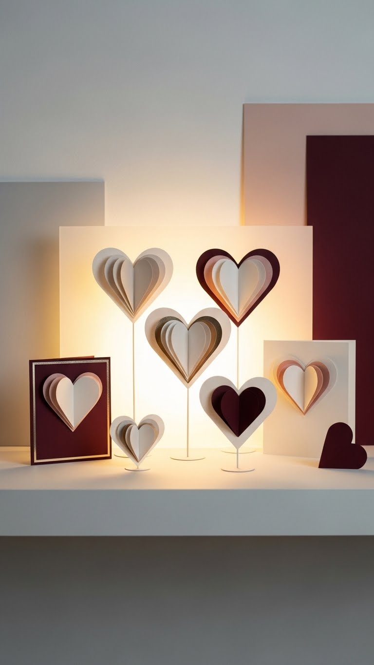 Bring a burst of handcrafted charm to your mantel or shelf with a pop-up heart card display that’s both playful and polished. You’ll arrange layered folded silhouettes on staggered stands, mixing sizes and textures for movement. Add subtle LED backlighting behind cards to create depth and mood. This airy, minimal arrangement feels liberated, magnetic, and easy to refresh seasonally.