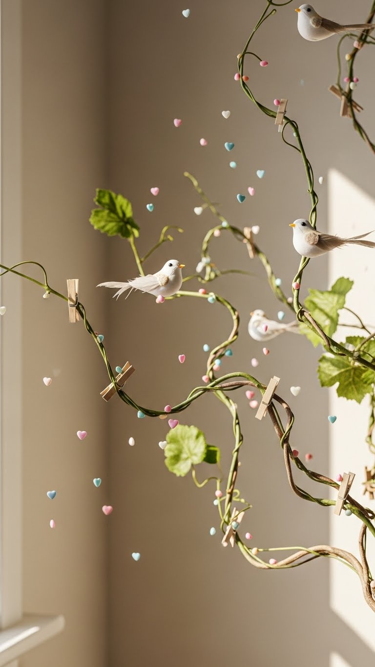 To add playful charm to your grapevine tree, scatter tiny heart sprinkles and perch delicate faux birds among the branches for texture and movement. You’ll use mini heart sprinkles sparingly for pops of color, then clip lightweight bird accents where they balance negative space. Keep lines clean, rotate placements for freedom of expression, and let airy simplicity feel deliberate and modern.