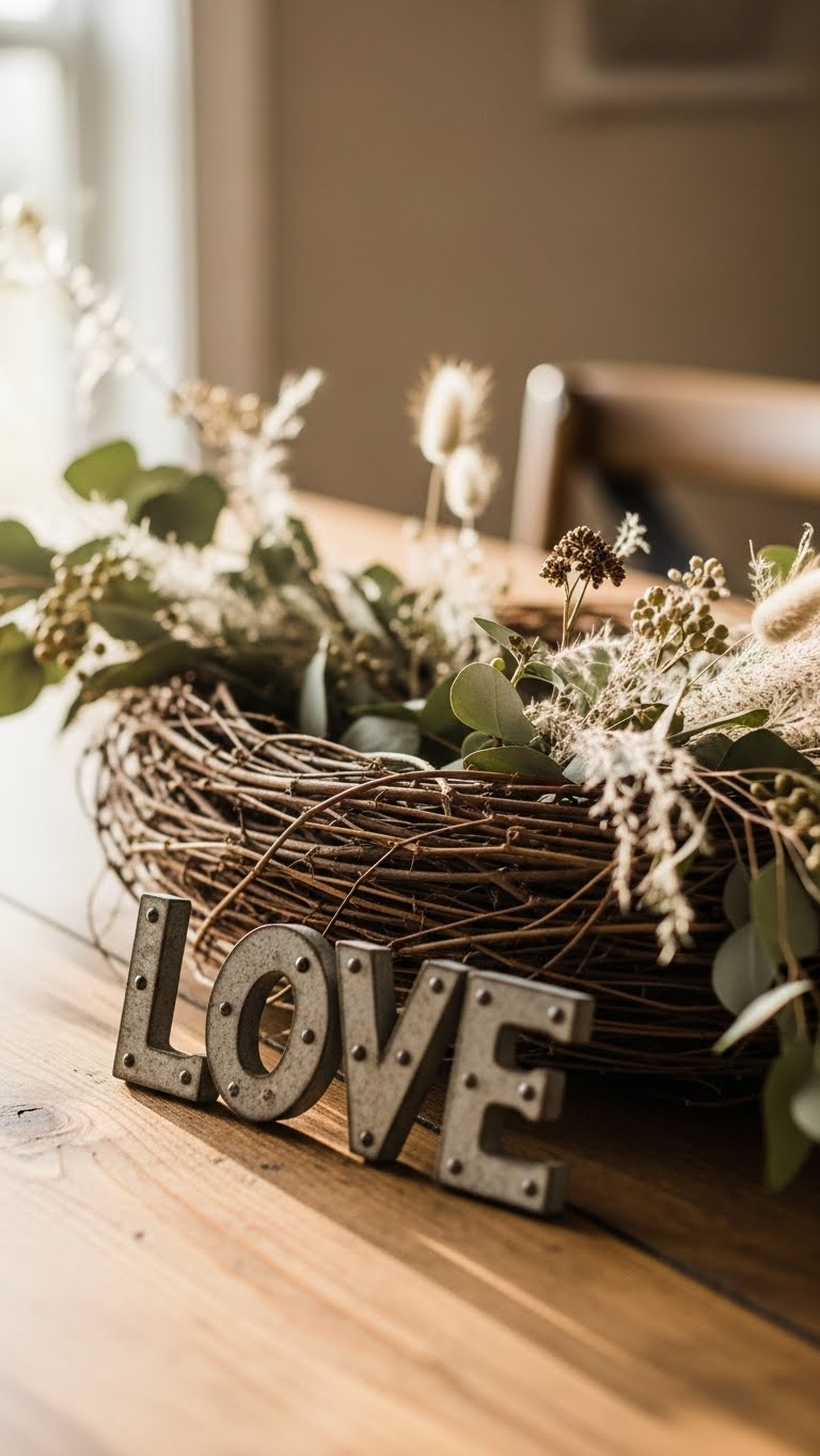 Center a weathered LOVE sign atop a low grapevine nest to create an immediate focal point that feels both rustic and modern. You’ll pair grapevine signage with airy centerpiece foliage—eucalyptus, dried grasses, a few fresh stems—to keep the look free and effortless.