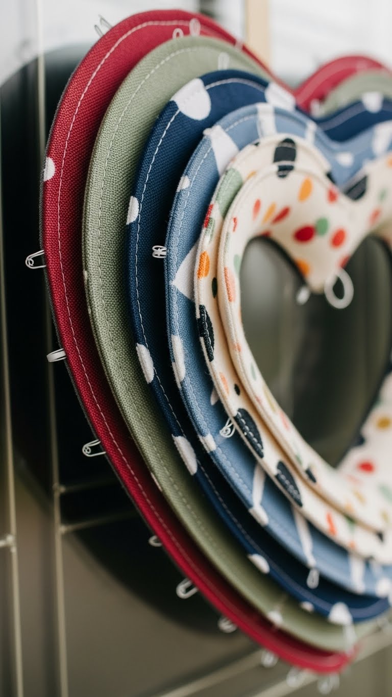 You’ll layer durable textiles, secure edges with heat sealing techniques, and attach a sturdy backing for longevity. Choose bold colors, minimalist patterns, and lightweight hardware so the wreath moves freely, resists moisture, and stays effortlessly chic through the season.