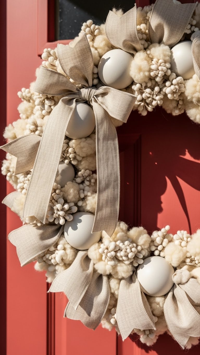 A cream-and-white wreath will soften a red-pink front porch and give it an instant, modern calm without fighting the existing color story.