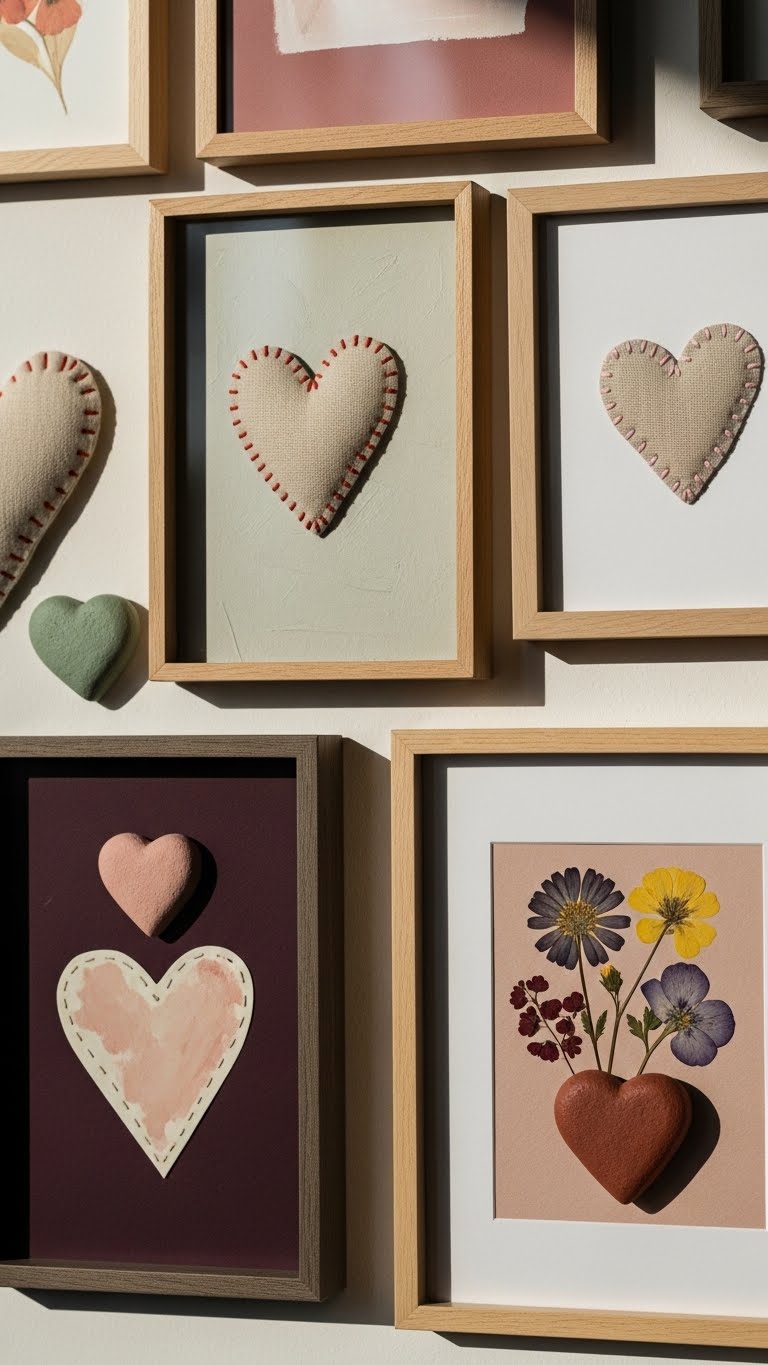 Layer in mixed materials and you’ll turn a simple wall into a tactile love note: mix painted paper hearts, stitched linen, framed pressed flowers, and small sculptural pieces to create a gallery that reads cohesive and modern.