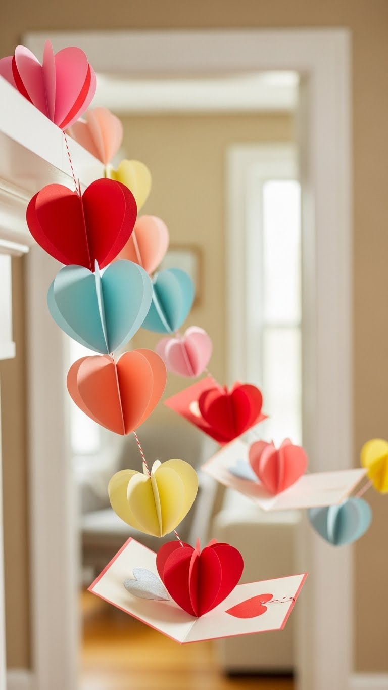 You’ll craft popup hearts from colorful cardstock, mix sizes, and string them into playful paper garlands.