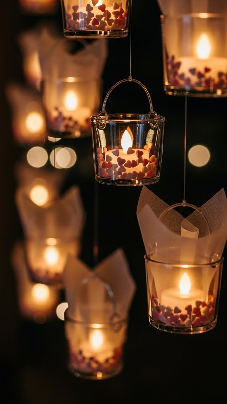 After your garlands catch the eye by day, let tiny votive holders steal the night with suspended heart sprinkles that glow from within. You’ll hang glass votives with battery tealights, experiment with glow techniques like diffused vellum, and tuck sprinkle refills nearby for effortless refreshes.