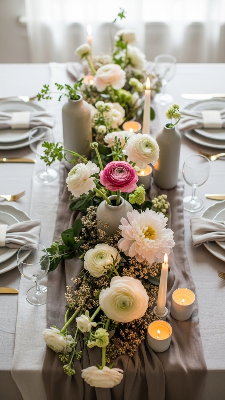 Create an effortless centerpiece by weaving ranunculus and peonies into a low, lush table runner that reads modern-romantic. You’ll mix silk flowers with fresh stems for lasting impact, tuck in greenery, and play with layered textures—linen, velvet, and matte ceramics—to keep it grounded. Set simple candles and minimalist place settings so the runner breathes; let the vibe feel free, chic, and unmistakably intimate.