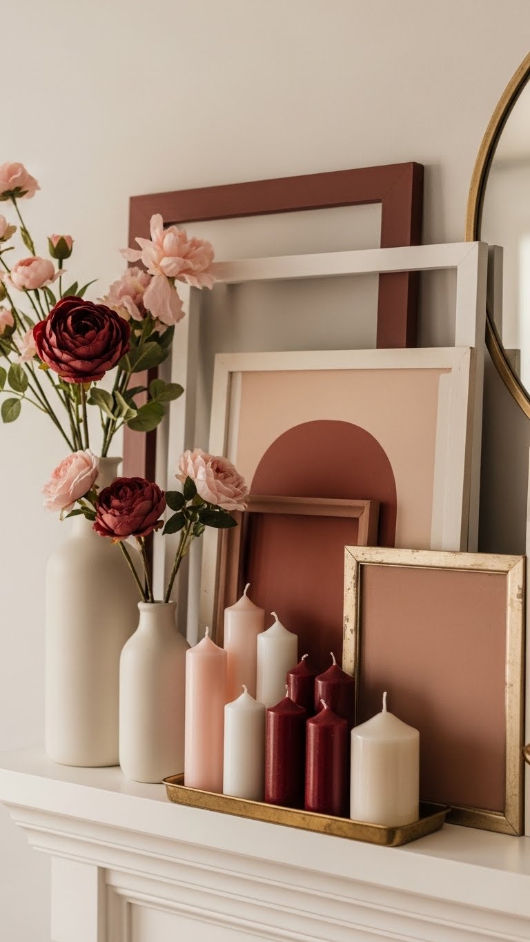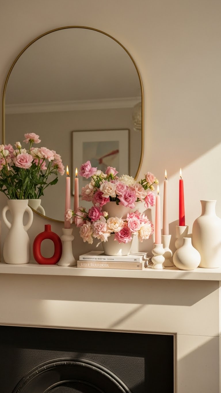 When you style a mantel in pink, red, and cream, aim for a balanced mix of romance and restraint—layer soft blooms, sculptural candles, and a few matte ceramics so the color trio feels fresh, not fussy.
