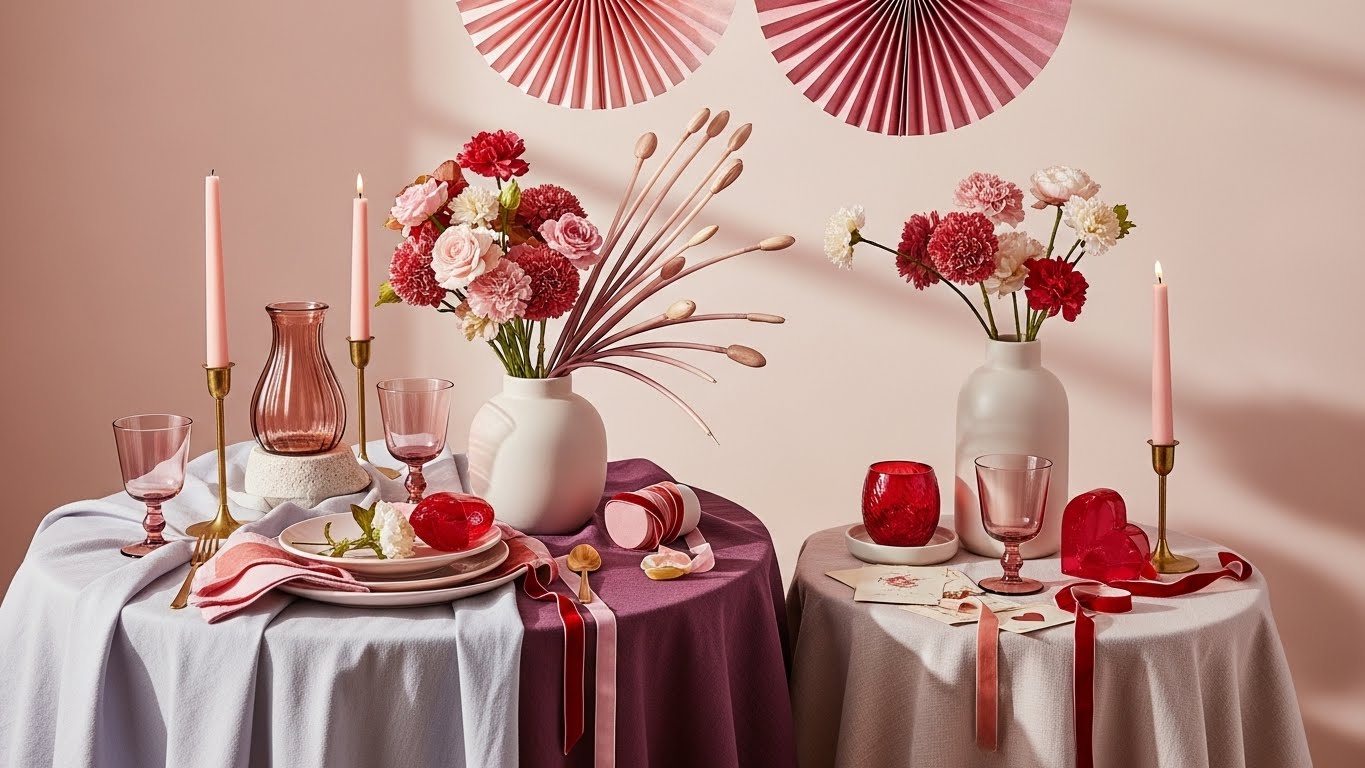 You’ll want to lean into layered textures and spirited prints—think blush runners over berry linens, piled faux bouquets in matte vases, and asymmetrical paper fans suspended for upward movement. Mix velvet ribbons, ombré stems, and vintage valentines with tinted glassware and brass candle accents to get tactile depth and nostalgic charm. These 25 playful pink-and-red ideas make every corner photograph-ready—and they start with a few surprising, easy switches.