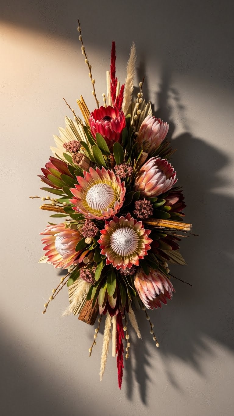 Pick protea for its striking shape and eco appeal. These flowers last longer and add height to walls. Buy a few stems online for around $15. DIY tip: Mount them on a foam board with pins. Layer with dried grasses for extra texture. This builds a statement piece fast. Use what’s in your garden if possible. Hang on a bare wall for drama. Protea brings modern flair without fuss. Break it down: Cut stems short and group in odd numbers. Add seed pods for contrast. This keeps costs low at under $20 total. Your wall will look professional yet personal. Give it a go for special occasions.