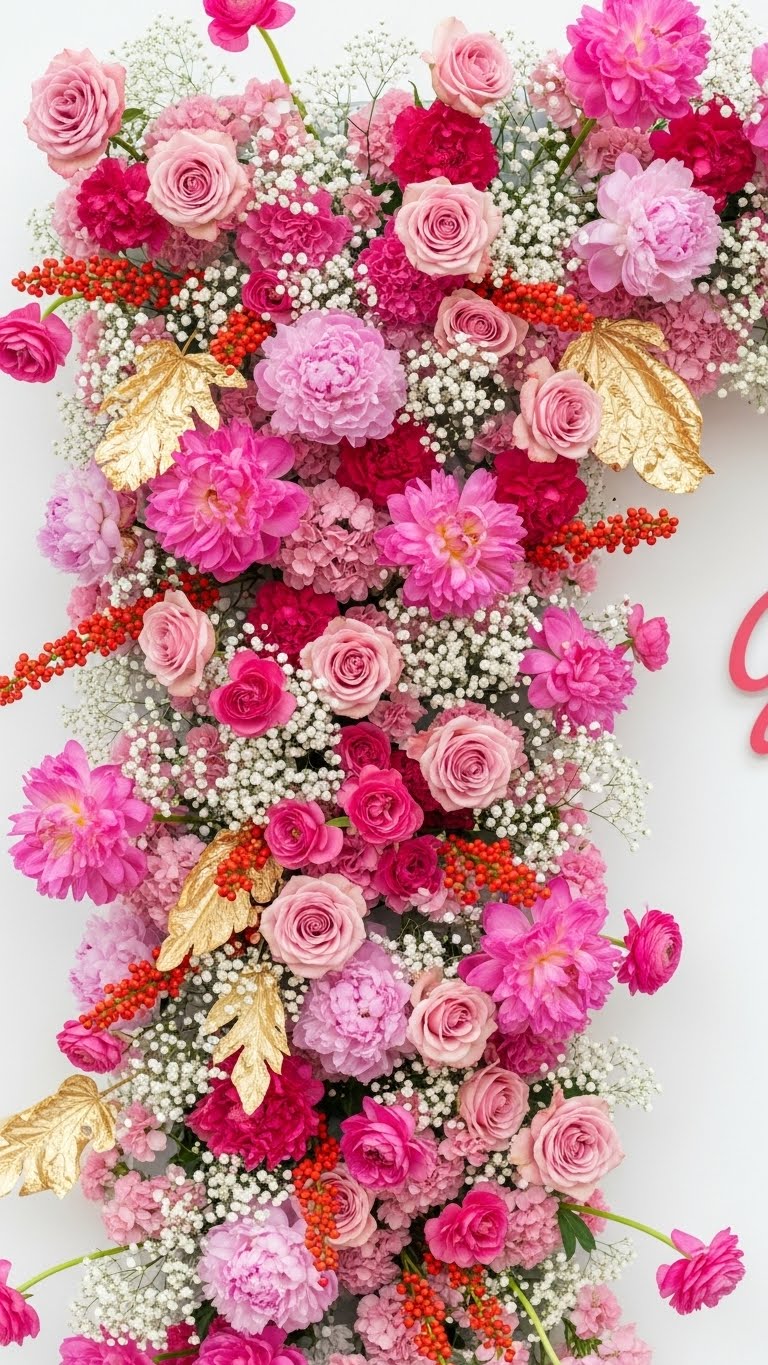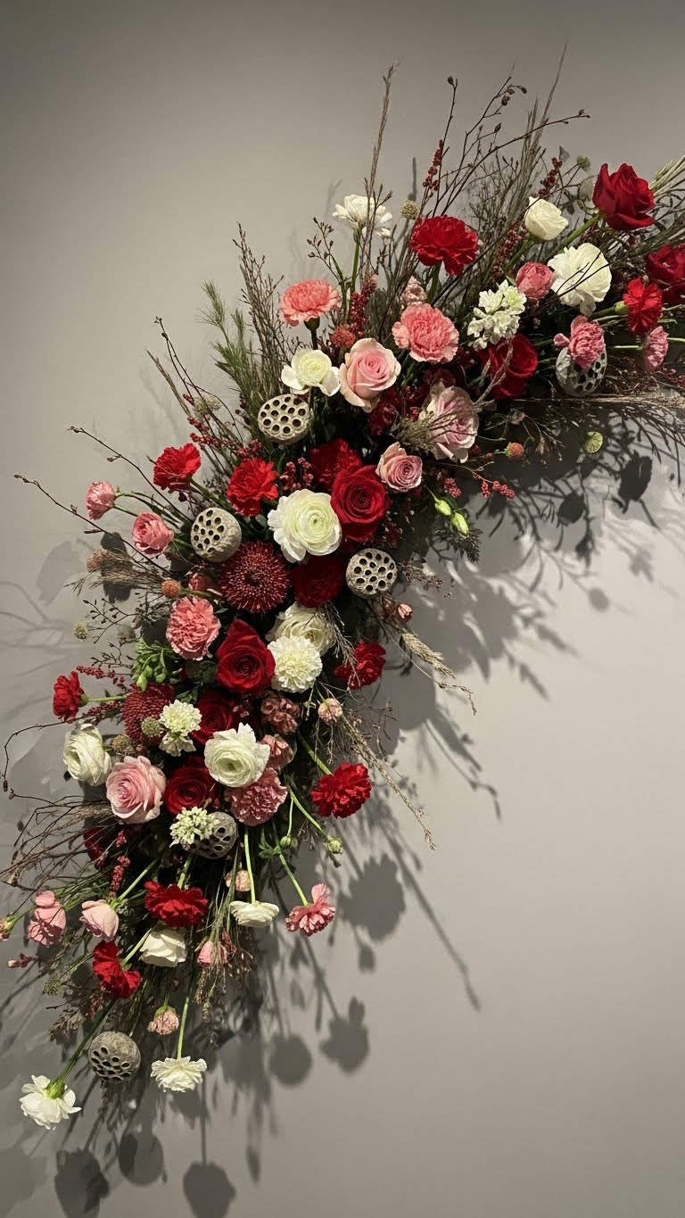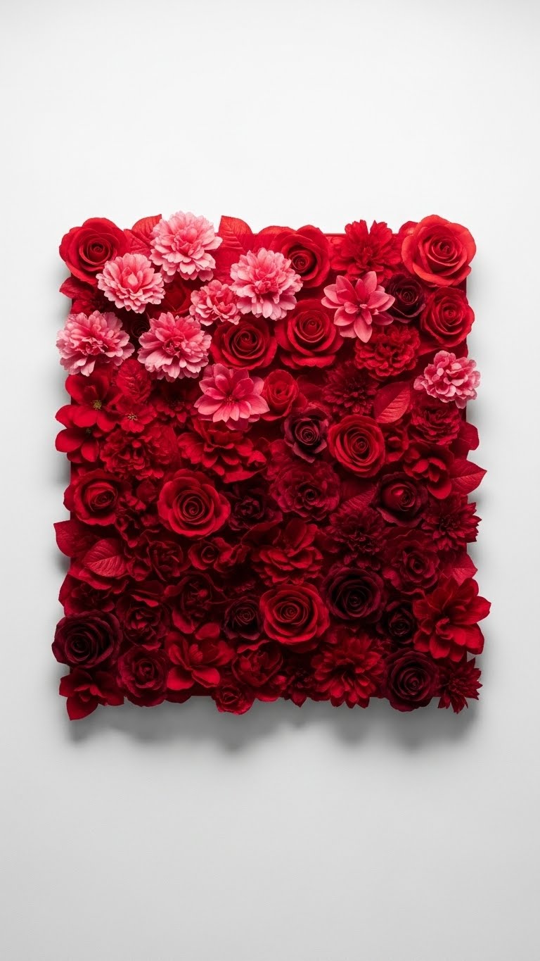 Layer reds from pink to deep shades for impact. Start with affordable red flowers from the store. Arrange by tone on a wall panel. This builds boldness easily. Budget tip: Use fake stems if fresh ones cost more. DIY idea: Glue to cardboard and prop up. It’s reusable and cheap. Focus on gradients for flow. Your wall pops with minimal work. Keep groups tight for effect. Total outlay: Around $8. Give this a shot for romance.