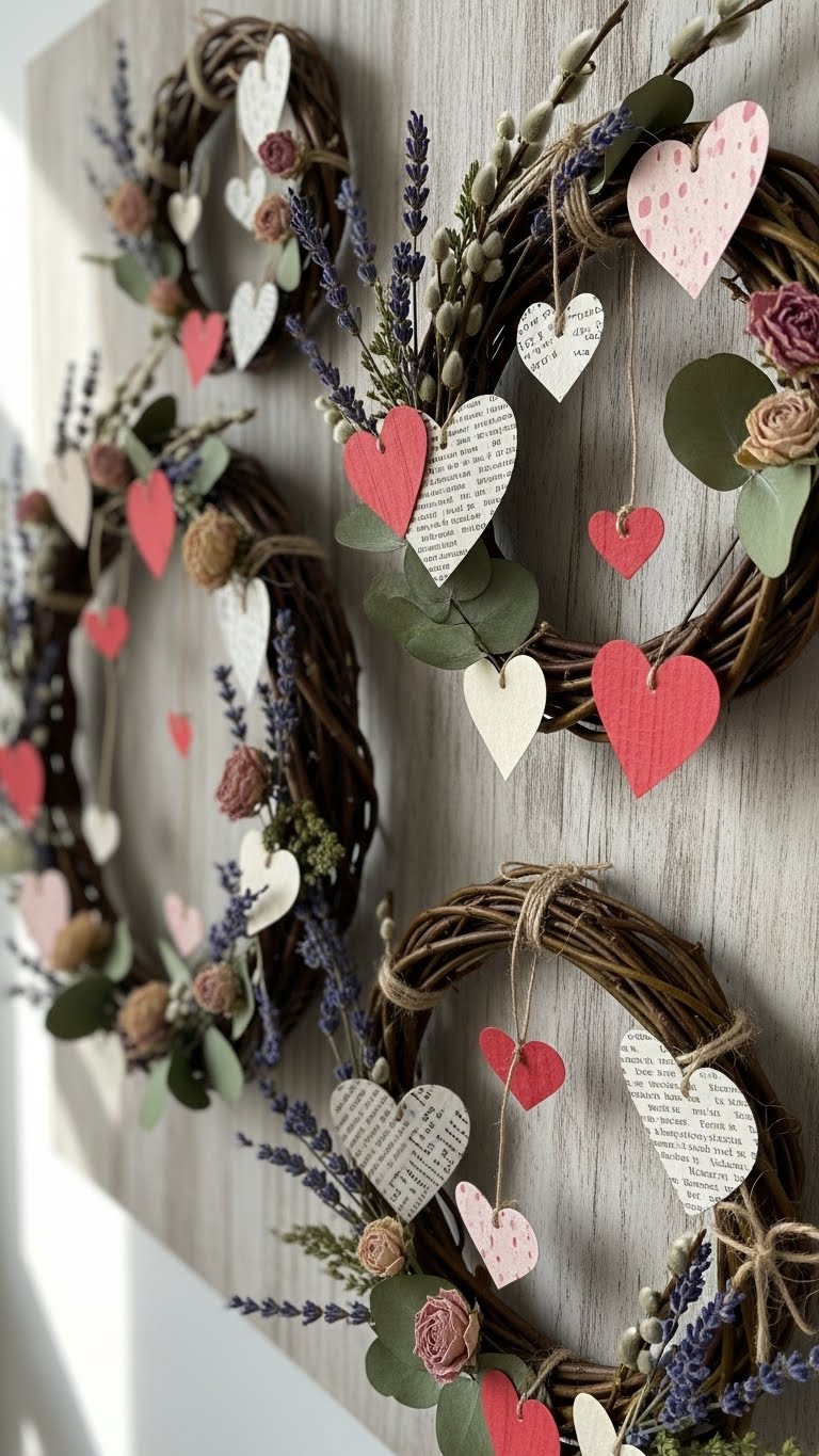 Opt for recycled paper and willow for green walls. Find materials at home or thrift stores. Weave into wreaths and hang. This saves money and the planet. DIY tip: Cut hearts from old paper and add flowers. Use what you have. Your wall looks thoughtful. Cost: Near zero. Make it meaningful.