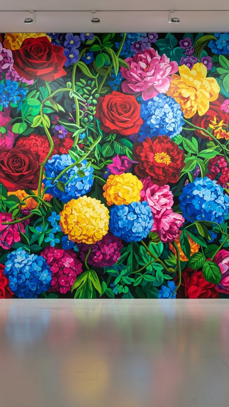 Layer colors for full impact. Use various flowers. Create a mural. This excites. DIY: Paint base. Budget: Materials at hand. Your wall vibrates.