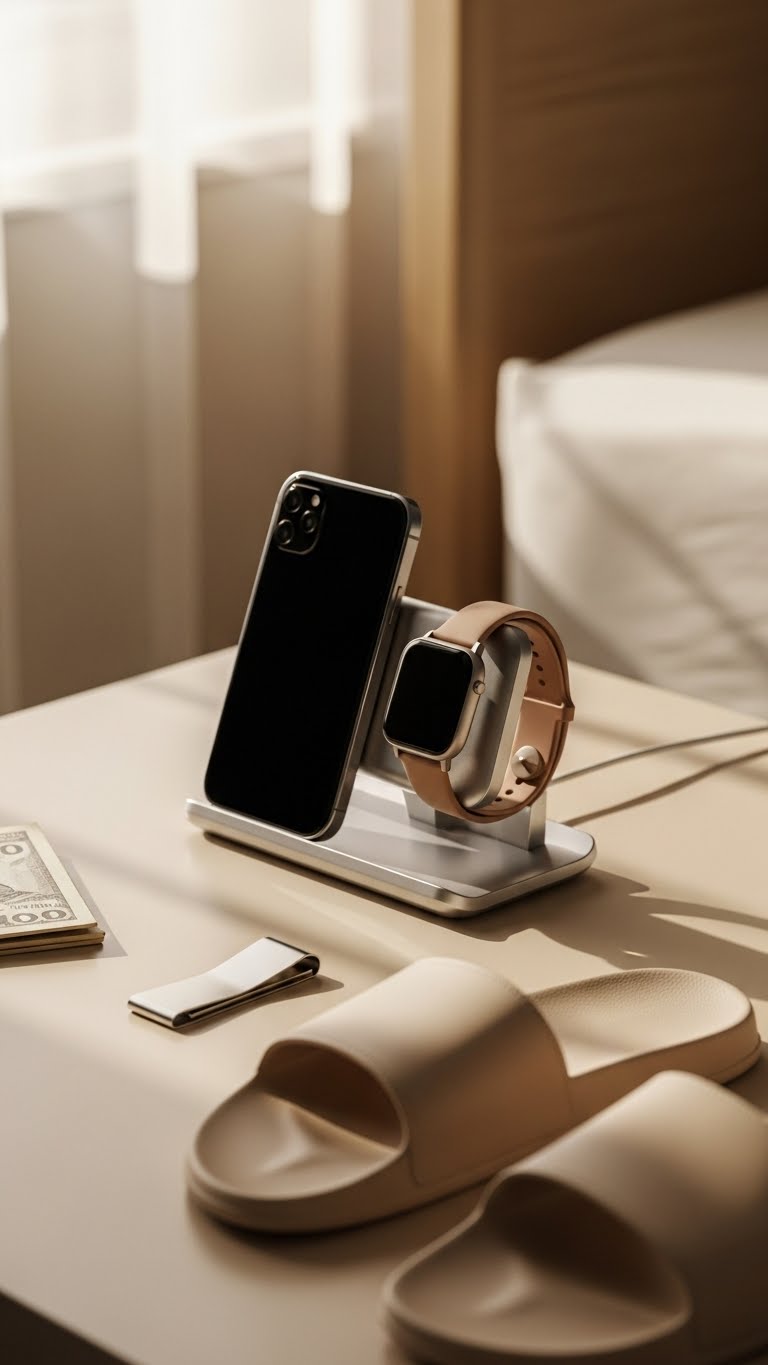 Pair an in‑1 charger stand with his new slides and money clip to tidy up his bedside or desk while powering both his phone and watch without the tangle. You’ll love the sleek magnetic charging dock that simplifies cable management, keeps surfaces minimal, and frees him from scrambling for cords.