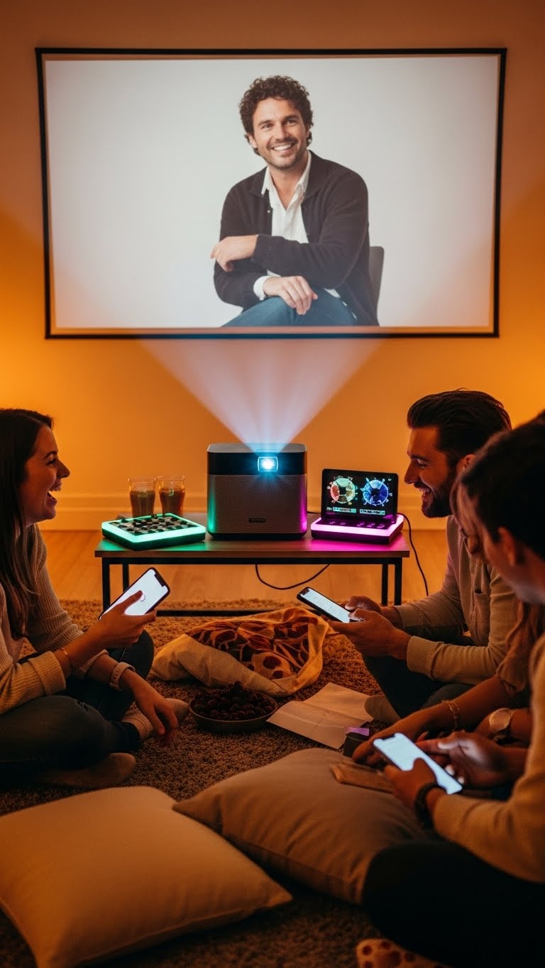 You’ll love a silent projector for movie nights and a compact party console that streams playlists, games, and socials.