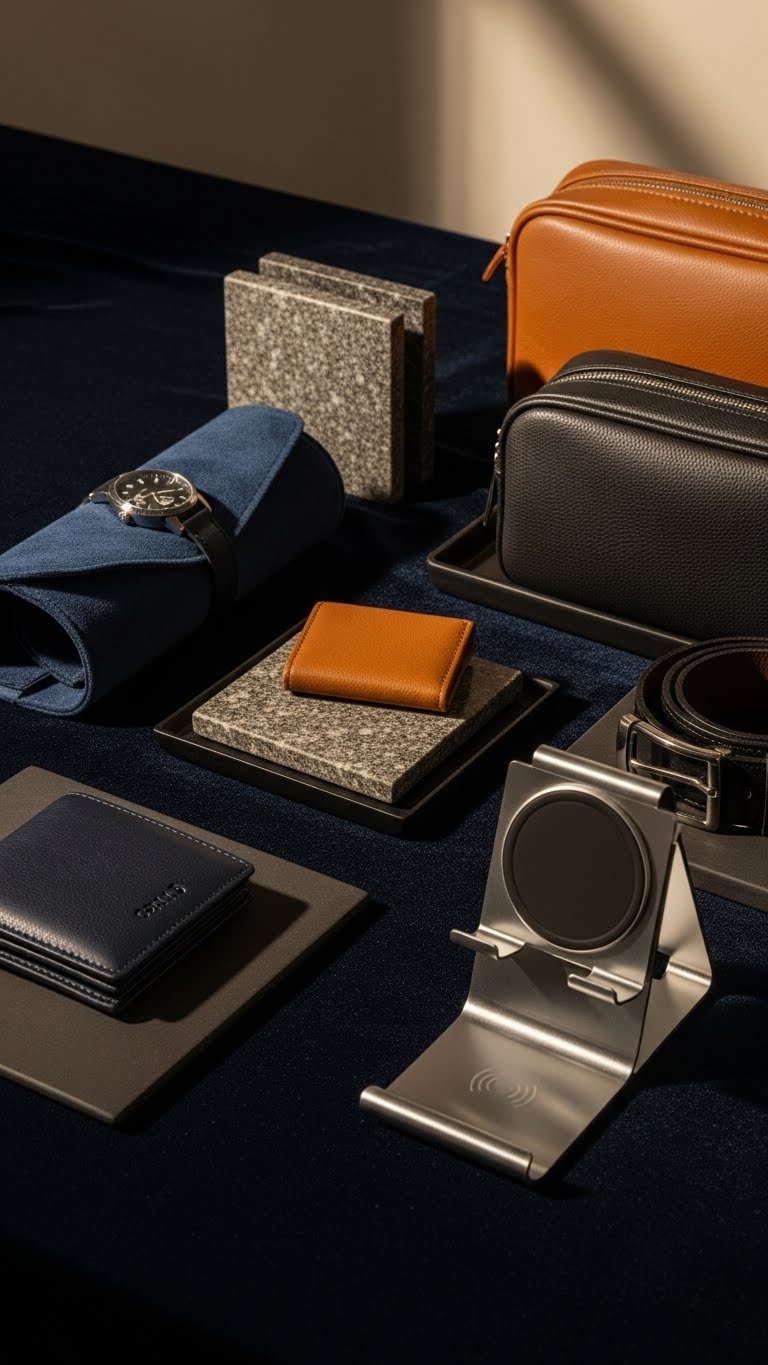 Dial up the wow factor without overspending by choosing pieces that read luxe at first glance—think velvet watch rolls, polished stone coasters, or a leather-trimmed dopp kit—that feel intentional and high-end.
