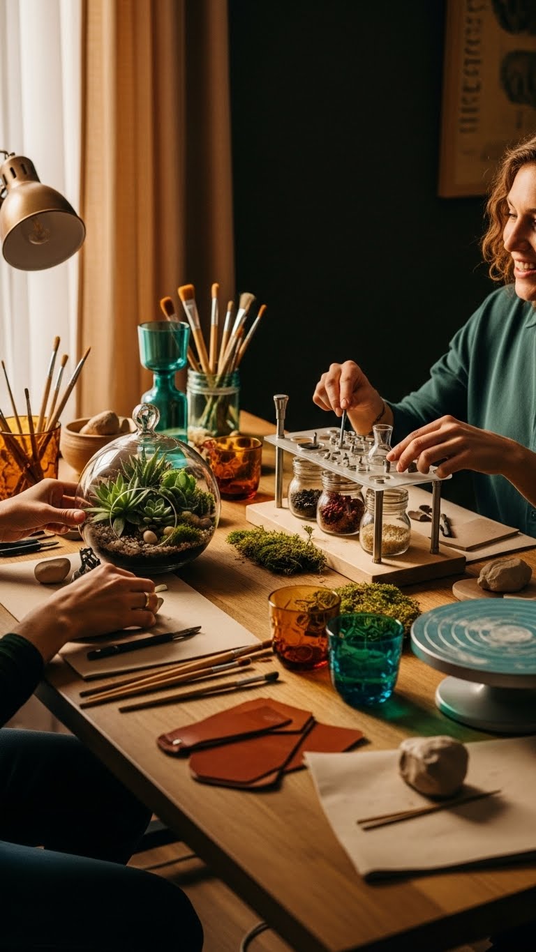 Kick off a creative date night with a shared-project kit that gets both of you hands-on and laughing together—think build-your-own terrarium, craft cocktail infusion set, or a leather-tooling starter pack. You’ll try DIY terrarium setups, tackle a pottery wheel class at home, or do collaborative painting while swapping ideas. Finish with couples journaling prompts to capture memories and spark future adventures.