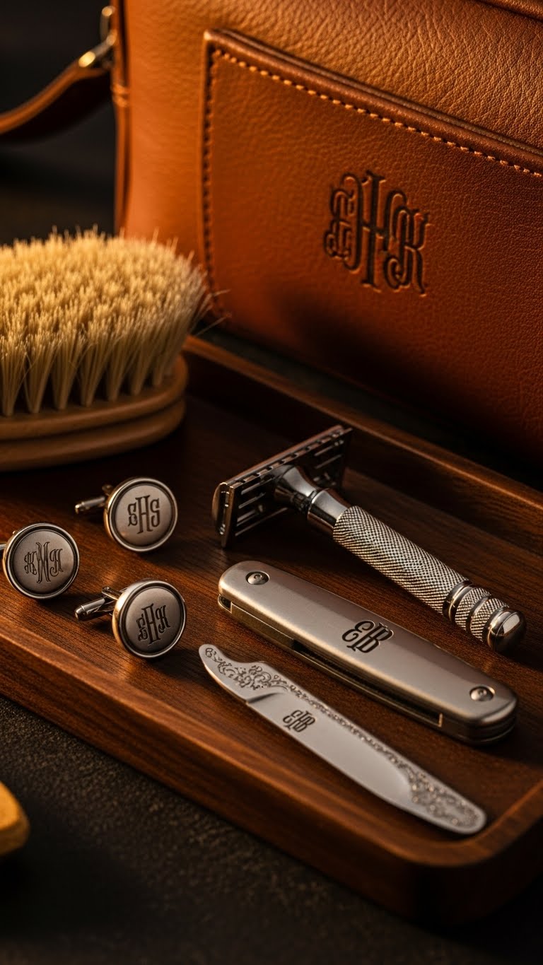 You’ll choose pieces that suit his style: an engraved razor for daily edge, a monogrammed brush for effortless charm. They’re practical, personal, and built to travel with him.