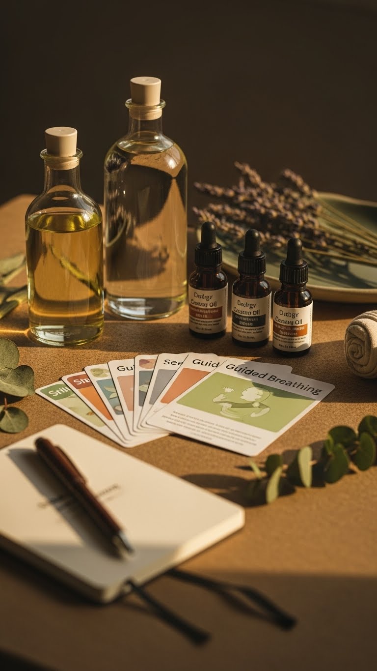 You’ll include guided breathing cards, simple aromatherapy journaling prompts, carrier oils, and a few essential blends.