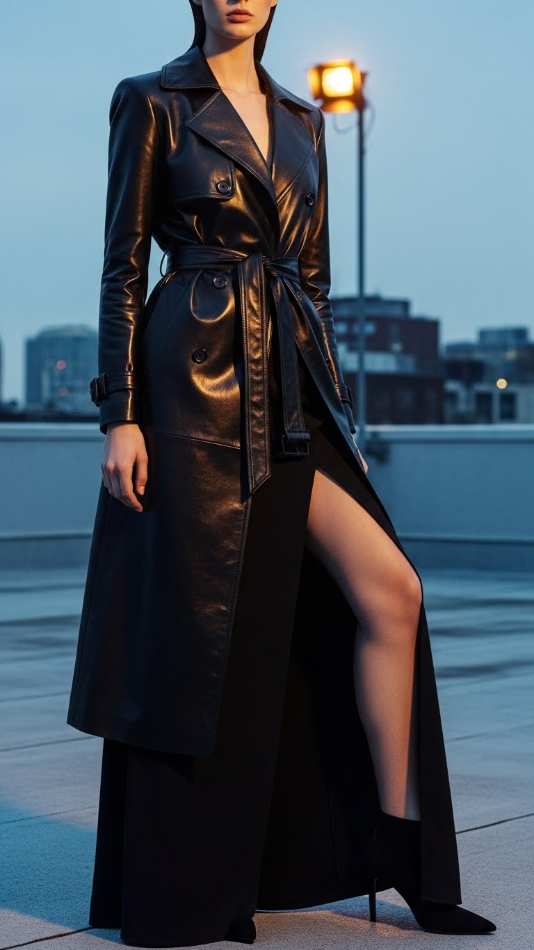 While the high-slit black dress brings instant drama, pairing it with a belted leather trench sharpens the silhouette and keeps the vibe modern and controlled.