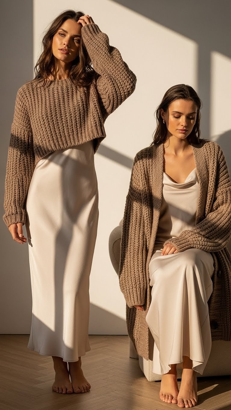 Move from the bold, structured drama of black lace and metal to something softer that still reads modern: a satin slip dress layered with a chunky cardigan gives you that polished-yet-cozy balance. You’ll play with layering proportions—cropped knit over bias silk, or oversized cardigan over slim slip—while minding satin care. Finish with ankle boots or minimalist heels to keep the look liberated and intentional.