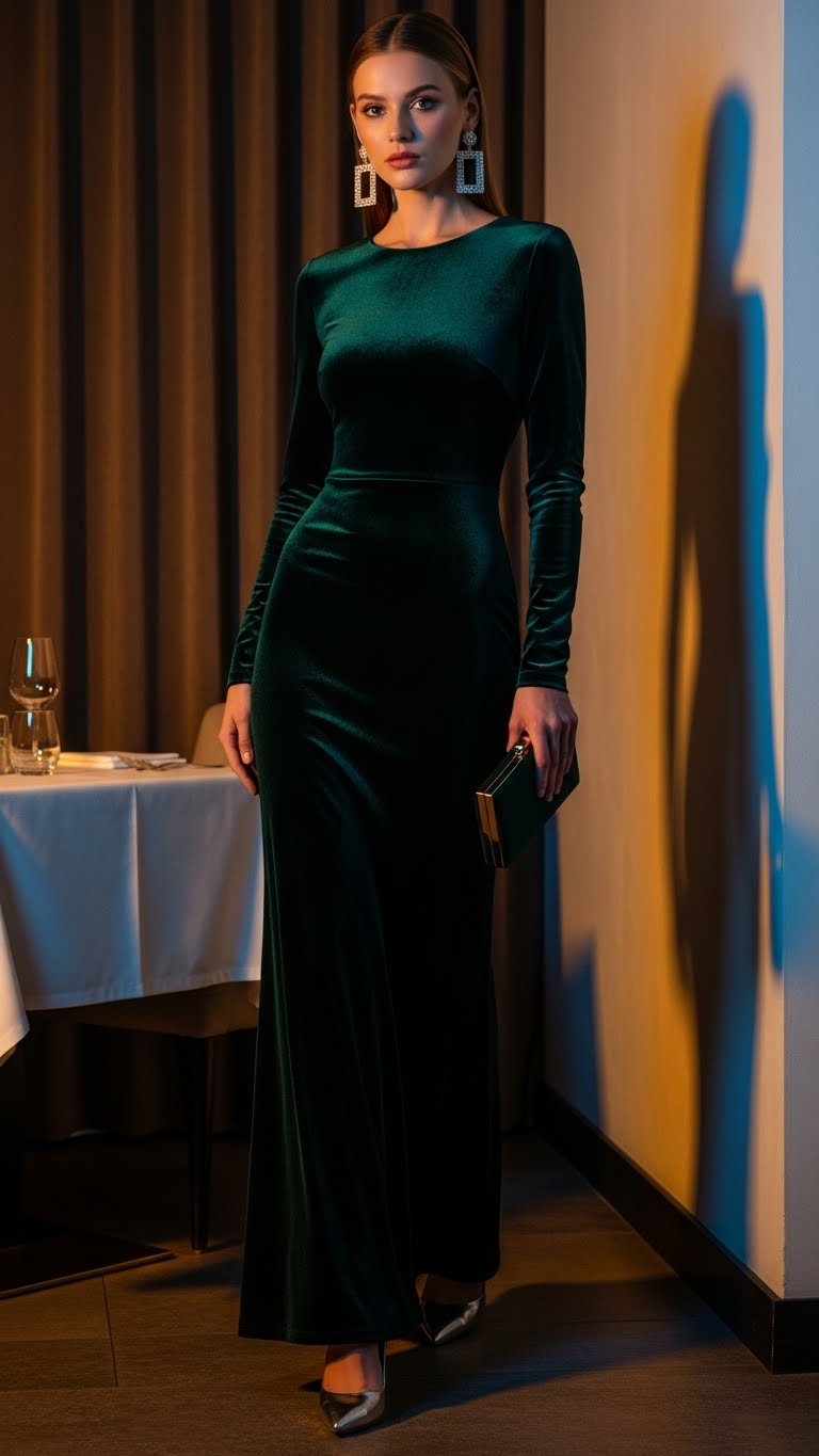 Tap into winter’s drama with a velvet maxi gown paired with bold statement earrings — the fabric’s rich depth and fluid drape feel inherently festive, while oversized or geometric jewels lift the look from formal to fashion-forward.
