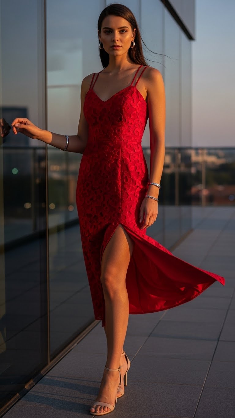 After the drama of a satin gown, a fiery red midi offers a sleeker, more modern way to make a statement—still bold, but streamlined for movement and evening plans that call for both style and ease.