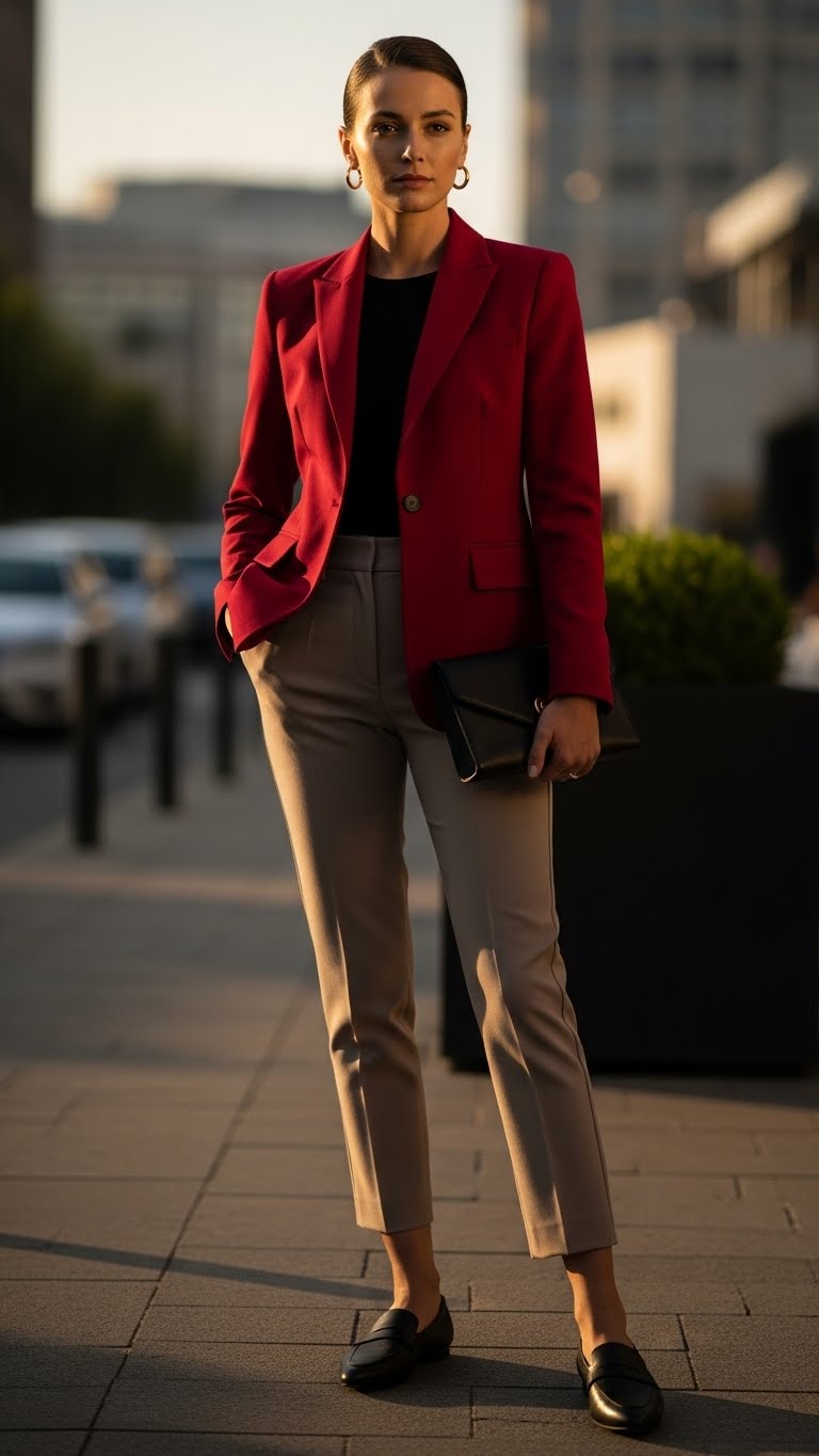 Tailored Red Blazer With Neutral Trousers for Dinner