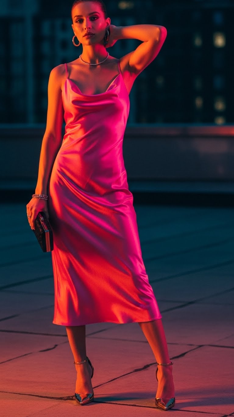 Turn heads in a hot pink slip dress that feels as effortless as it’s electrifying, pairing its slippery silhouette with gilded heels to balance playful color with luxe polish.