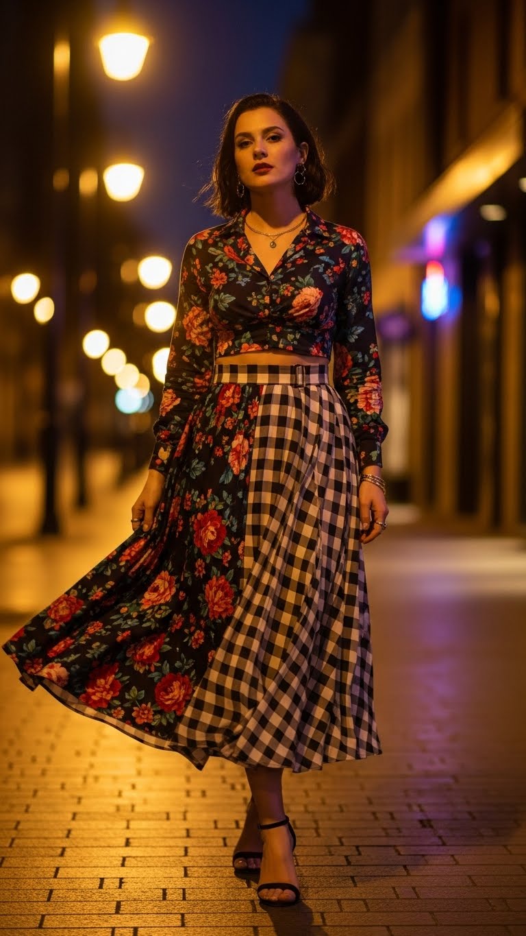 Make a statement in coordinated color and pattern: a bold-print matching set—think cropped blouse and high-waist skirt—gives you instant polish with zero guesswork.