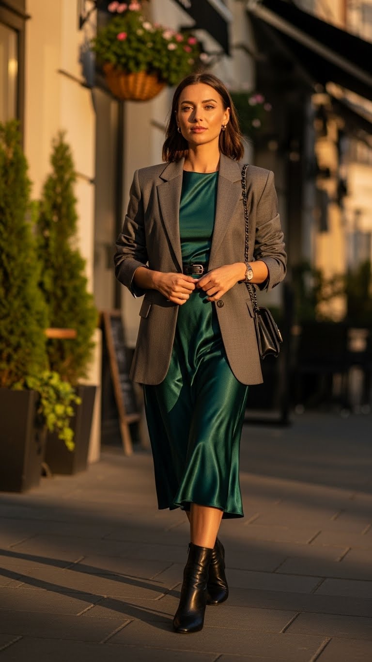 Choose crisp blazer tailoring to contrast fluid satin, cinch the waist with a belt, pick sleek ankle boots, and learn basic satin maintenance. The result feels confident, liberated, and effortlessly put-together.