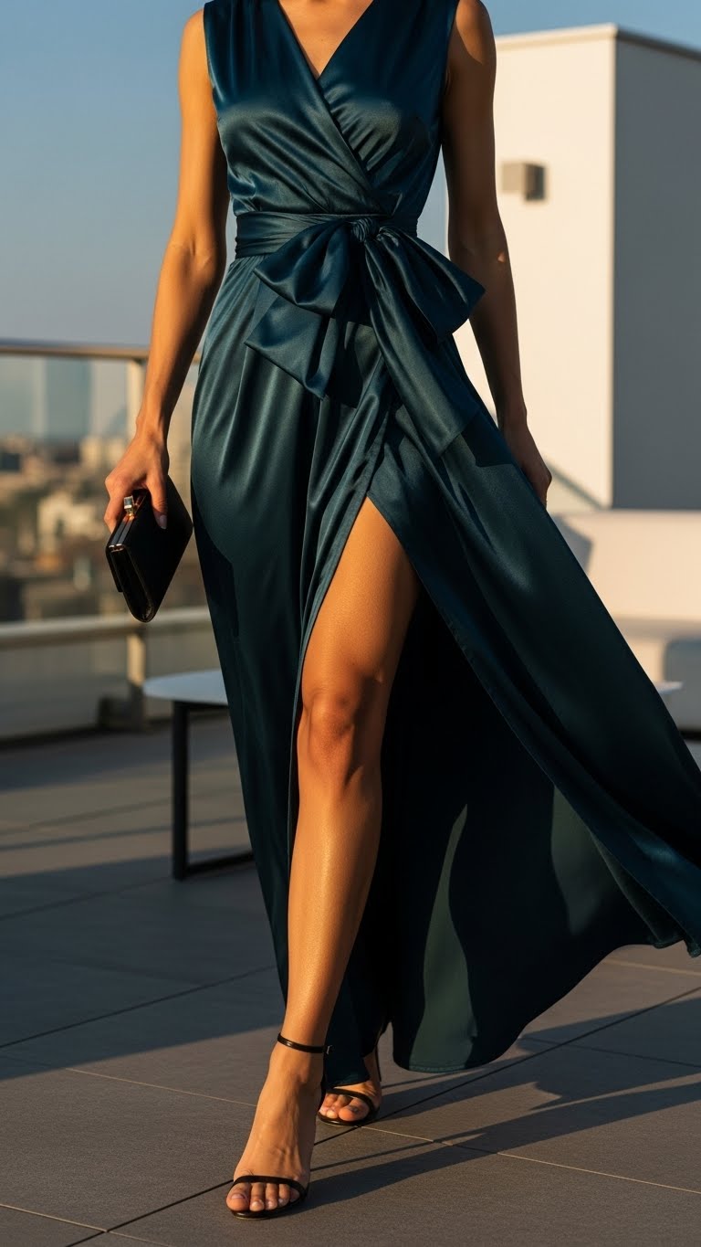 When you want drama without sacrificing ease, a high-slit satin wrap dress with a bow gives you just that.