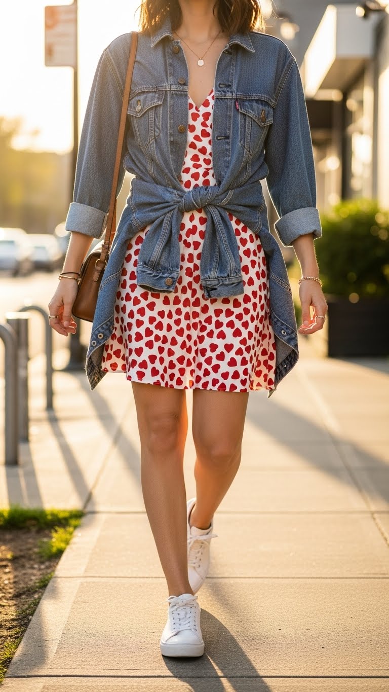 Kick your look into casual-chic territory by pairing a flirty heart-print dress with crisp white sneakers and a lived-in denim jacket; the combo instantly balances sweet and street-ready. You’ll own a casual chic pairing that feels effortless and bold. Mix delicate hearts with a retro athleisure blend—roll sleeves, knot the jacket, and choose minimal jewelry so your confidence leads the vibe.