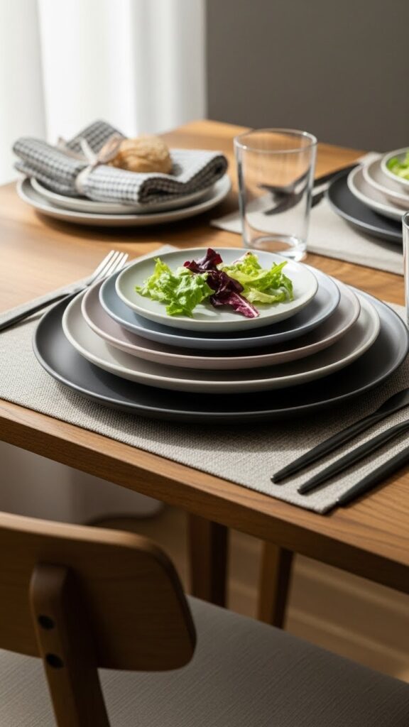 Stack plates with intention to create a polished, layered place that reads as both stylish and effortless. You’ll pair matte chargers with mixed-glaze dinnerware, offset by a petite salad plate in a soft hue.