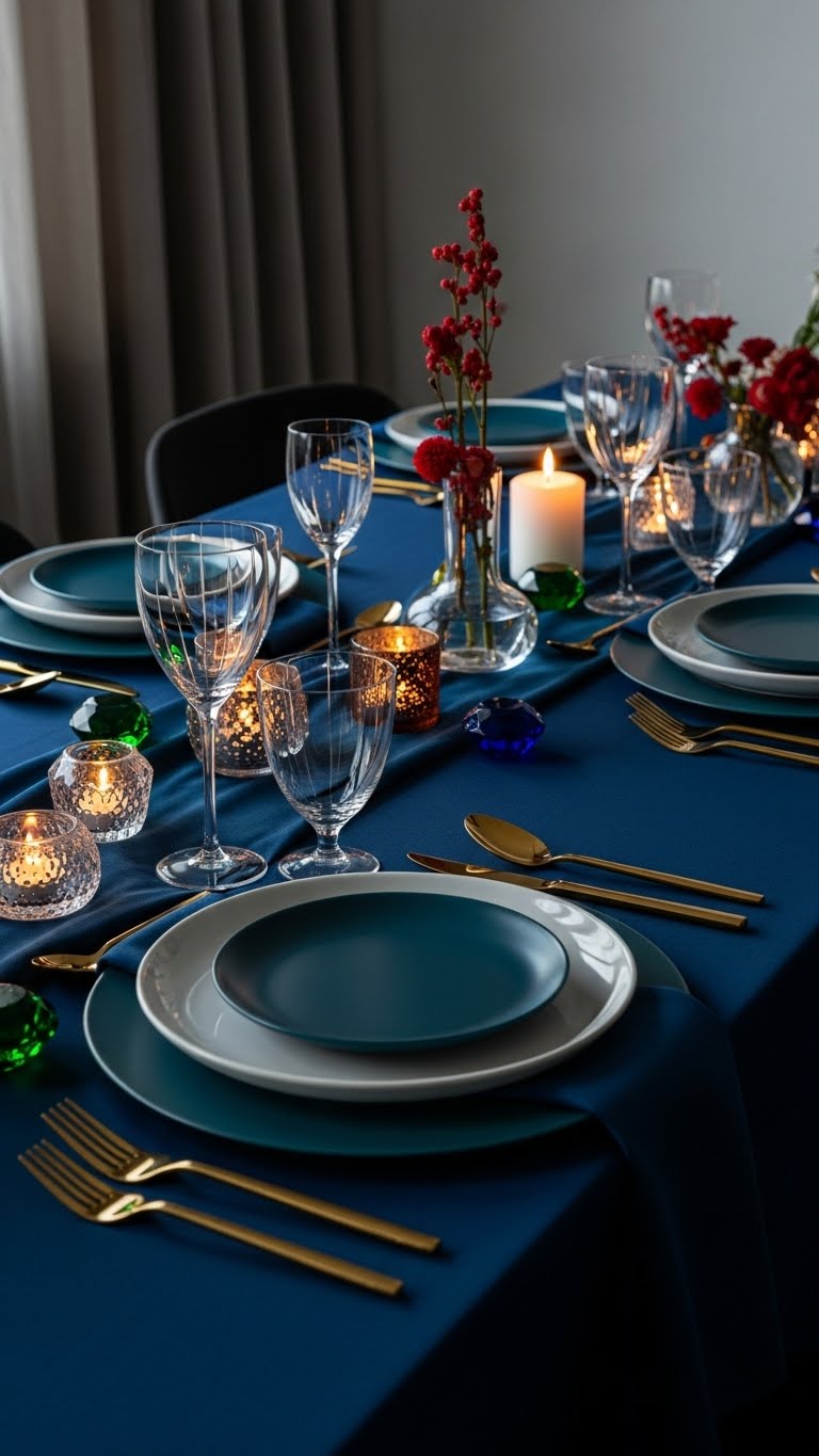 Scatter jewel accents—gem-like votives, brass flatware—to catch candlelight.
