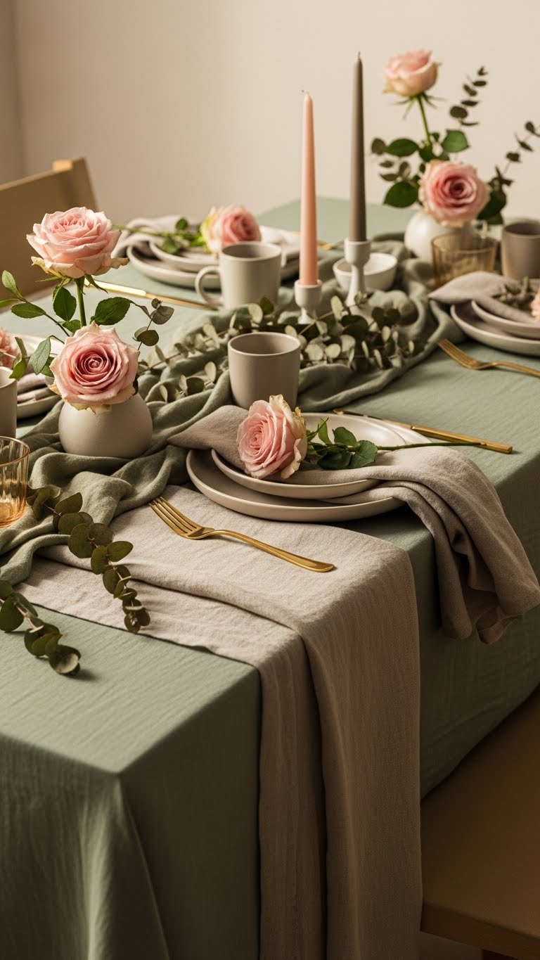 Layer linen runners, scatter dried eucalyptus sprigs, and pick matte ceramics for an effortless, curated vibe.