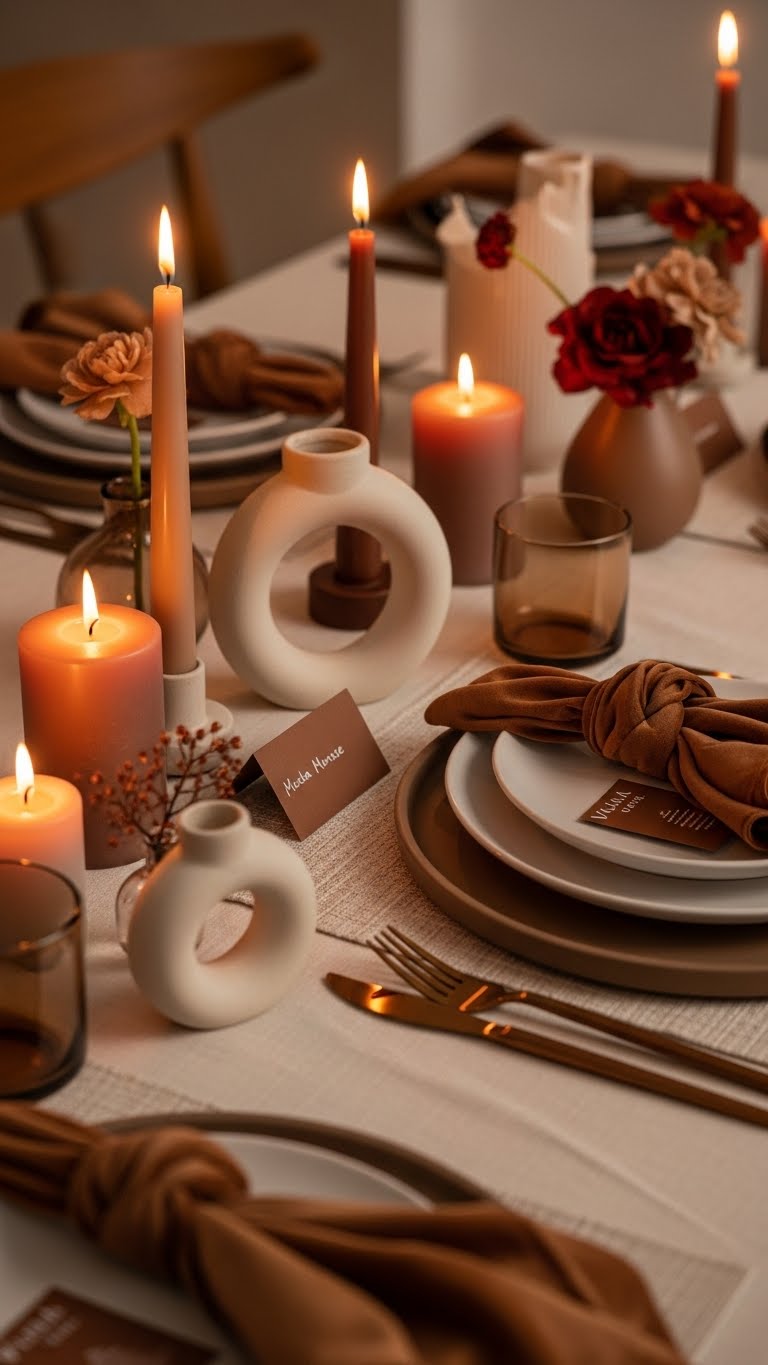Tucked into a palette of coffee-toned neutrals and soft creams, your Mocha Mousse setting feels quietly luxurious—think velvety browns, satin candles, and sculptural ceramics that read modern and warm.