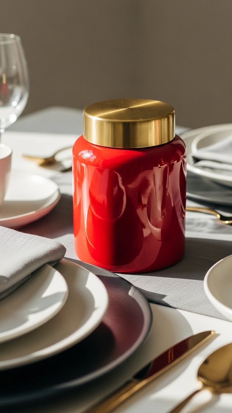 Introduce a Red & Gold apothecary jar as a bold, romantic punctuation on your table—its lacquered crimson body and burnished brass lid catch the light and anchor the setting with vintage-inspired glamour.