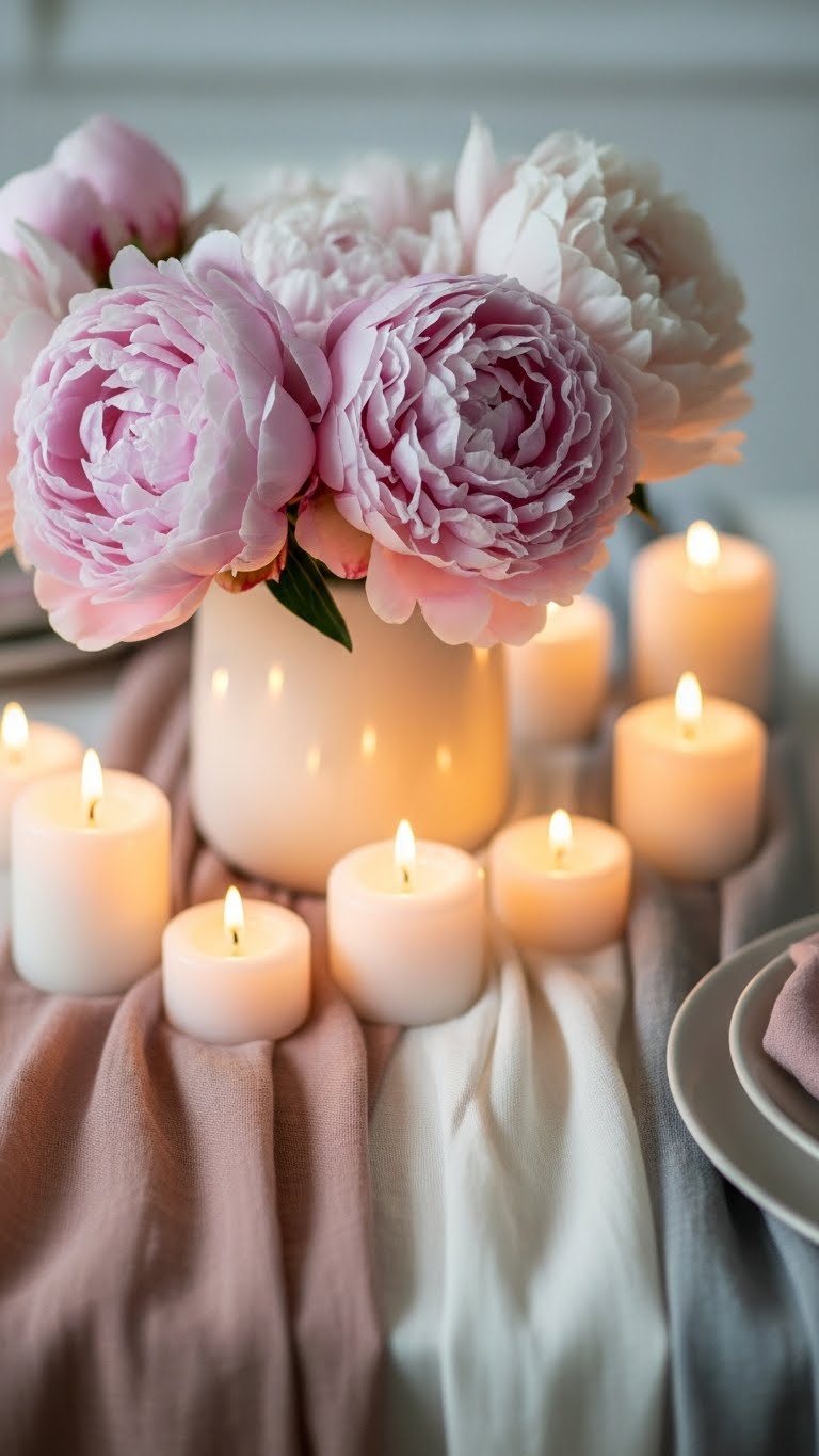 When you nest soft-blushed peonies amid clusters of low pillar candles, the table instantly feels like a whispered promise—lush blooms spill over a simple vessel while flickering light sculpts petals into pearly planes.
