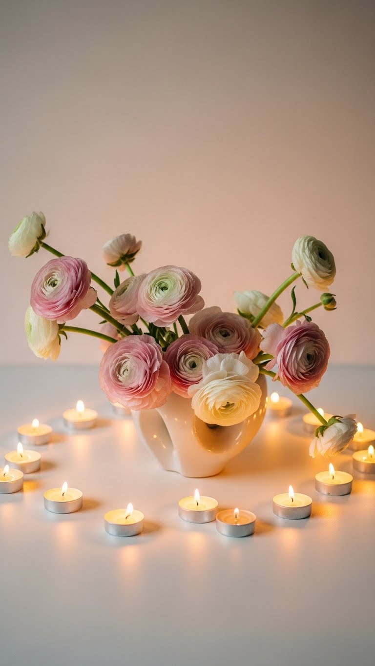 You’ll pair soft ranunculus in loose, airy bunches with scattered tea lights glow for intimate warmth.