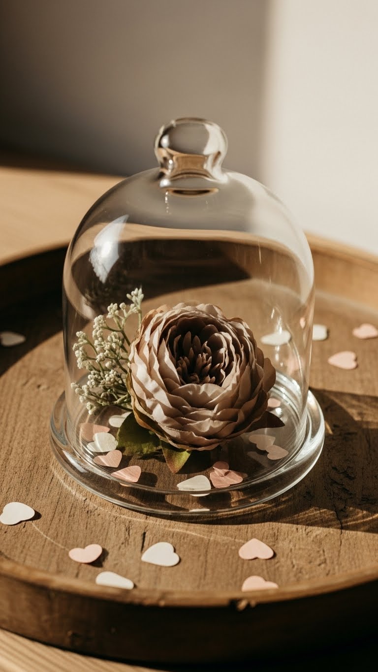 Set a glass cloche over a small cluster of faux blooms and tiny paper hearts to create an intimate, curated vignette that feels both modern and cozy.