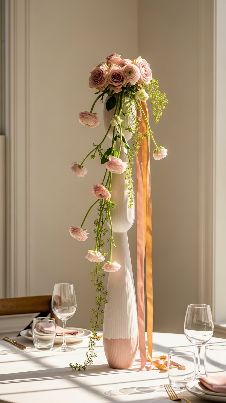 You’ll choose a sculptural piece with a tall silhouette, then drape trailing blooms and ribbon for effortless cascading movement.