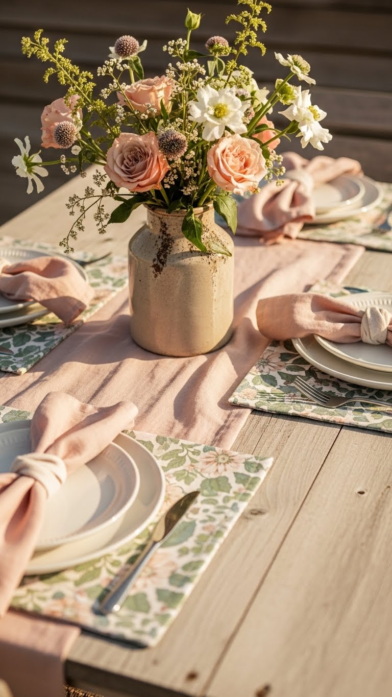 After the relaxed, rustic feel of a farmhouse vase, soften the whole look with a blush linen runner and floral placemats that gently lift the table into romantic territory.
