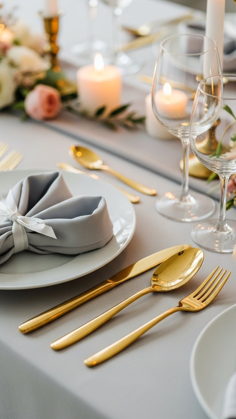 Keep settings airy and intentional, mixing metallic warmth with soft textiles so each place feels curated, confident, and effortlessly free.